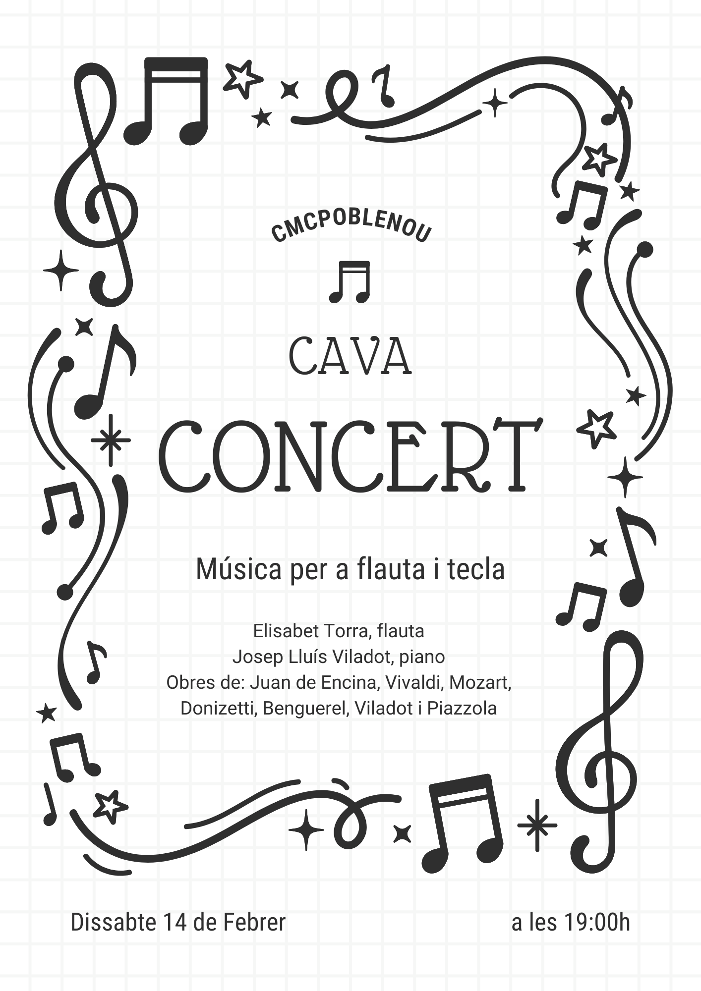 Dissabte 14, a les 19:00h Cava Concert: Música per a flauta i tecla XXI temporada Elisabet Torra, flauta Josep Lluís Viladot, piano Obres de: Juan de Encina, Vivaldi, Mozart, Donizetti, Benguerel, Viladot i Piazzola