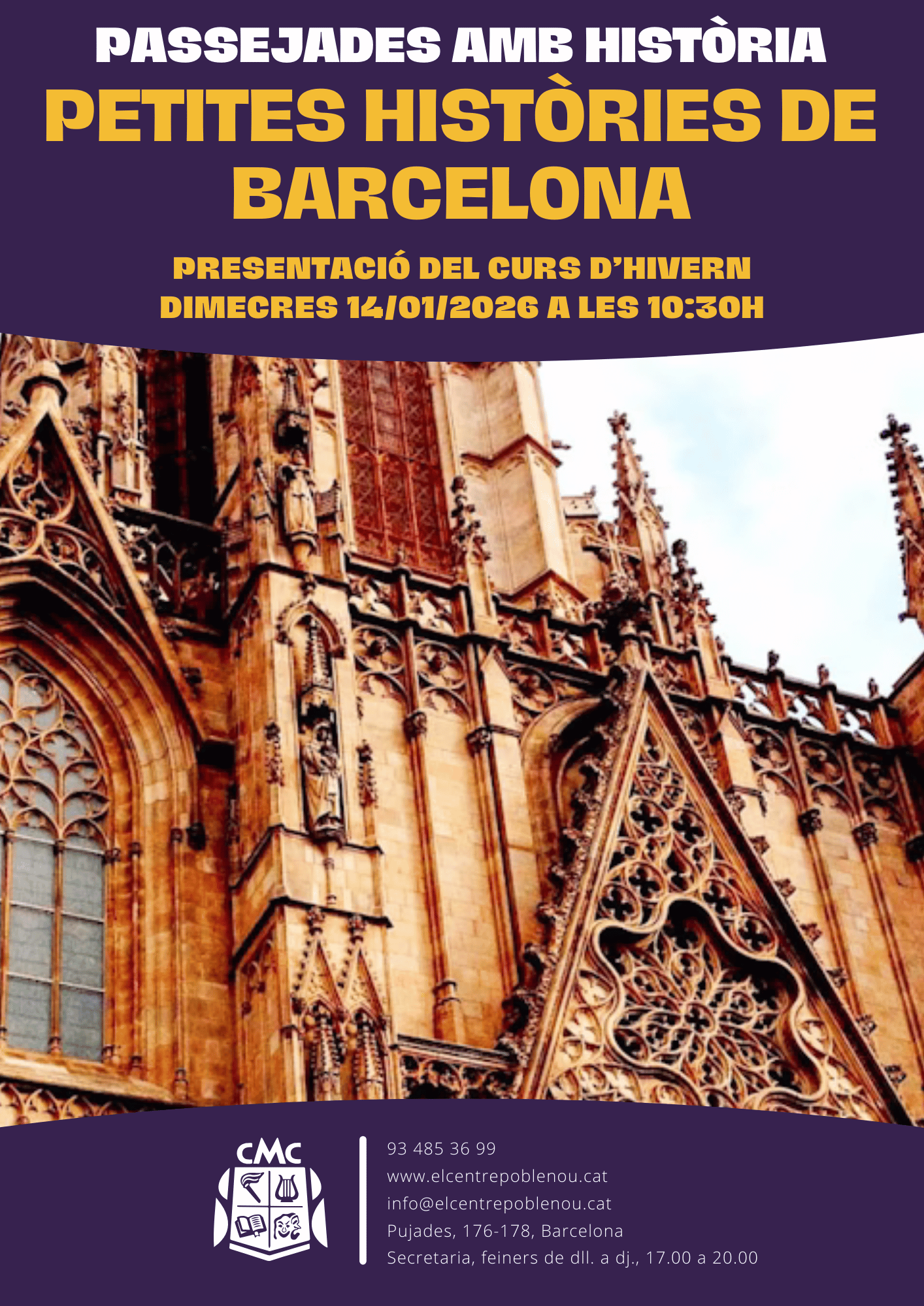 Dimecres 14 de gener a les 10:30h PASSEJADES AMB HISTÒRIA Presentació del curs d'hivern 2026 de les passejades amb història amb Maite García Borderia que aquest trimestre es titula: PETITES HISTÒRIES DE BARCELONA Informació i reserves a secretaria del centre.